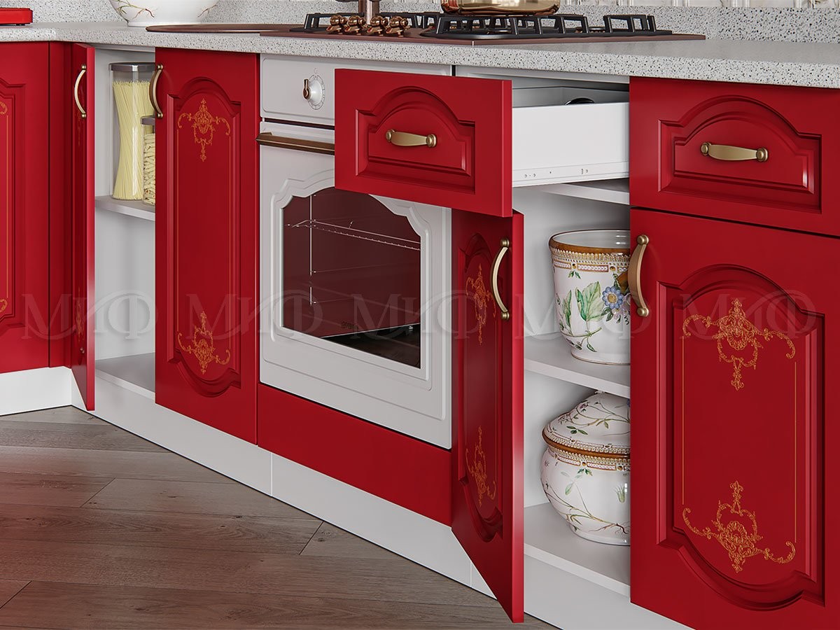 • Классическая кухня «Версаль» очарует вас своим исполнением и красивой цветовой гаммой. Ненавязчивый, нежный рисунок на фасаде идеально гармонирует со стилем и дизайном кухни. С таким кухонным гарнитуром не стыдно принять гостей и приятно провести время в семейном кругу или с друзьями.